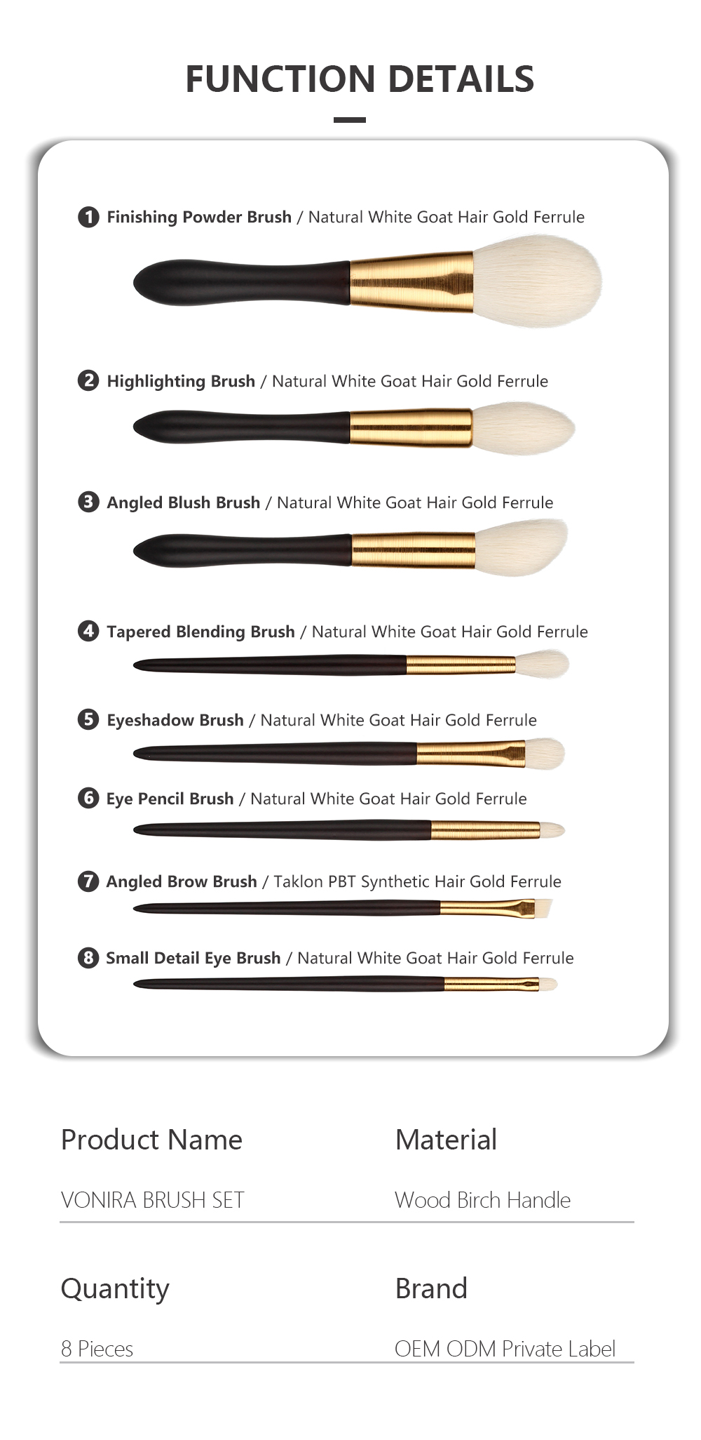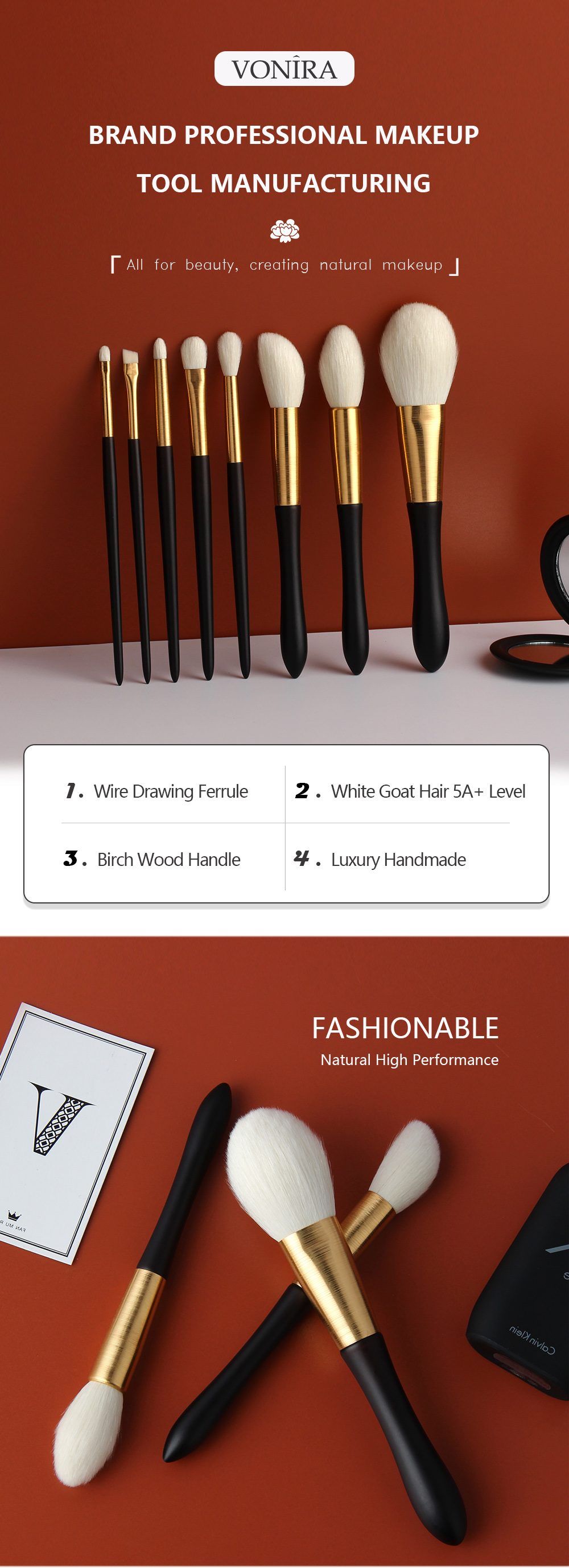 Global Best Manufacturer Vonira Beauty 8 Pieces Essential Natural White Goat Hair Makeup Brushes Set WIth Golden Wire Drawing Ferrule Wood Handle